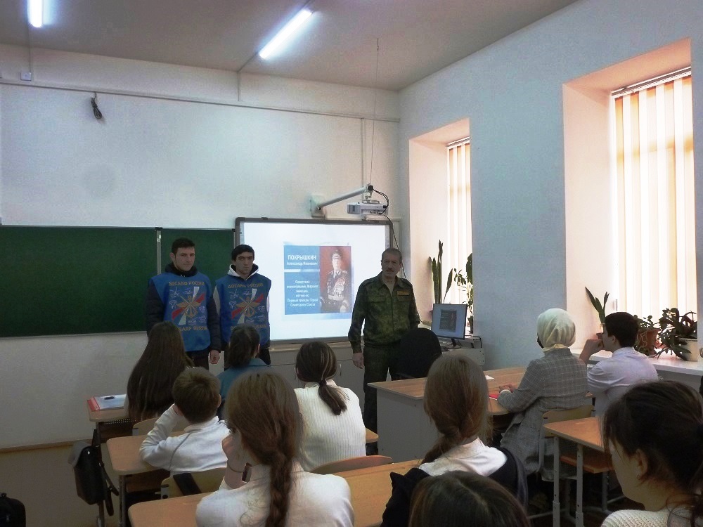 05 марта 2026 года в рамках Всероссийского месячника оборонно-массовой работы и 99-й годовщины образования оборонной организации ДОСААФ в СОШ № 1 г. Дербента был проведен Урок мужества, посвященный 113-летию со дня рождения первого трижды Героя Советского Союза маршала авиации Александра Ивановича Покрышкина.